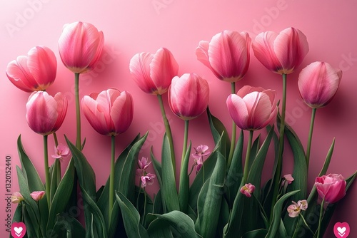 Fototapeta premium Valentine's Day Celebration with Pink Hearts and Tulips on Pastel Pink Background