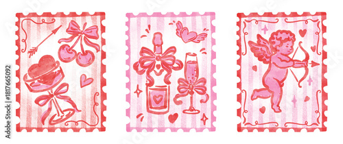© ola-la, Fototapeta premium Valentine's Day Postage Stamp Clipart Set, Hand Drawn Vintage Love Stamps with Cherub, Champagne, Heart, Bow, Cherry, Romantic Pink Illustrations