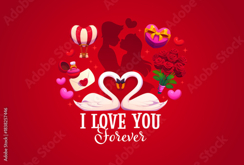 © Vector Tradition, Fototapeta premium Valentine's day quote i love you forever. Romantic party vector greeting card, love day quote. Saint Valentine holiday saying with swans, rose flowers, engagement ring and couple in love silhouette