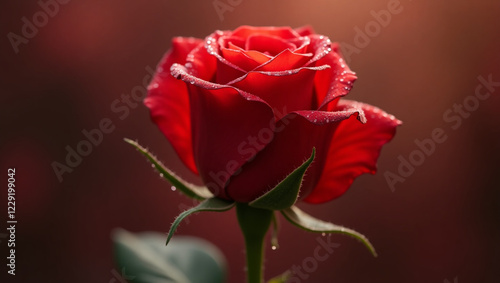© Mangaldip, Naklejka premium "Valentine's Day Red Rose with Dew Drops in Macro Photography, Detailed Petals and Soft Lighting"