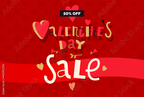 © dot_studio, Naklejka premium Valentine's Day Sale Poster with Lettering and Decorative Elements. Modern Flat Vector Illustration. Social Media Ads.