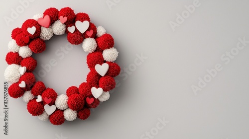 © Kunalai, Obraz premium Valentine wreath Decorative heart-themed in red and white on a light background.