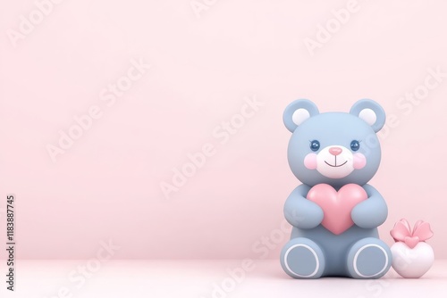 Fototapeta premium Valentines concept. Cute blue teddy bear holding a heart on a soft pink...