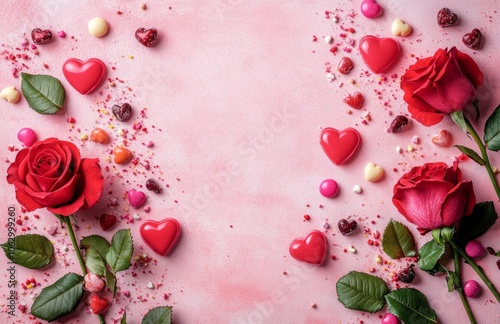 Fototapeta premium Valentines Day background with red roses and heart-shaped candies on pink