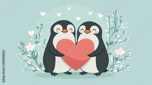 © Elena, Obraz premium valentines day cartoon penguins holding big red heart together on soft mint background