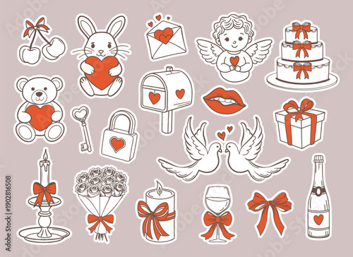 © Tatiana, Fototapeta premium Valentines day doodle stickers set. Romantic hand drawn love elements collection.