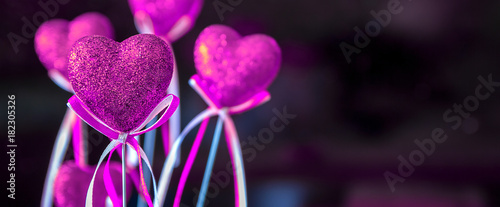 © ruslan_khismatov, Fototapeta premium Valentines day. Pink hearts on dark blurred background close-up with copy space for congratulation, border design panoramic banner