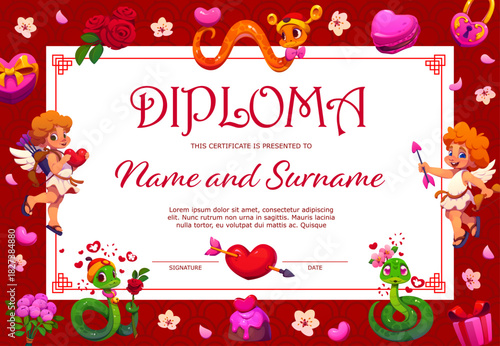 Fototapeta premium Valentines diploma certificate with cherubs, snakes and hearts. Cartoon...