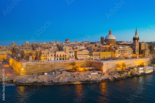 Naklejka premium Valletta - capital of Malta. Aerial view, sunset, evening, church, blue sky...