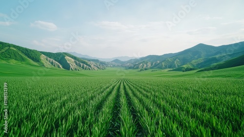 Naklejka premium Valley meadow and expansive, A vast green field stretches towards distant...