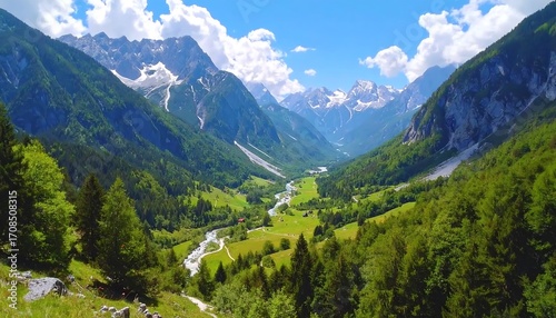 © aldi, Obraz premium Valley view with green mountains and snow capped peaks under a blue, cloud-spotted sky