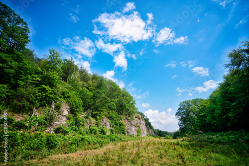 Obraz premium Valley with green fields under a blue sky