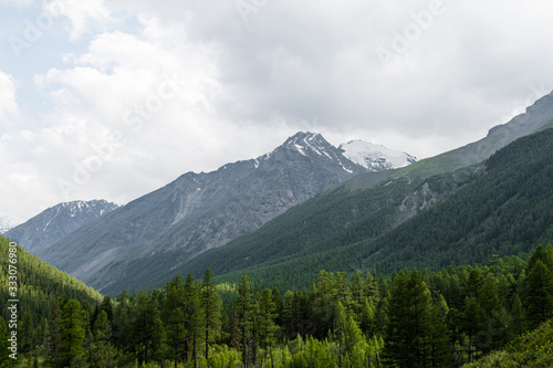 Fototapeta premium valley with pine forest and rocky peaks on horizon, mountain tourism, outdoor...