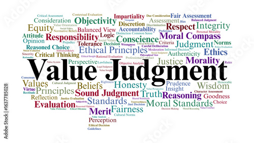 Obraz premium Value Judgment Word Cloud. Keywords About Ethics, Morality, Integrity, And Fairness