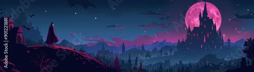 © InkCrafts, Fototapeta premium Vampire in gothic castle, moonlit night, flat design illustration