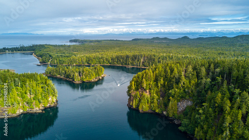 Fototapeta premium Vancouver island. Dron's view. Forest, water and boat