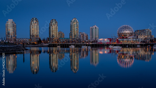 © hpbfotos, Naklejka premium Vancouver Skyline at the Blue Hour with Lights on the Science Center Globe at night on the Eastern Shore of False Creek Inlet, British Columbia, Canada