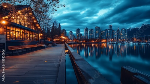 Obraz premium Vancouver Waterfront at Dusk. Cityscape, Harbor, Restaurant, Calm.