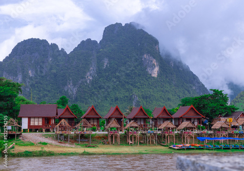 Fototapeta premium Vang Vieng Laos a beautiful city on the river with huge rising mountains and...