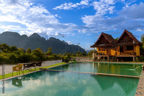 Naklejka premium Vang Vieng Laos a beautiful city on the river with huge rising mountains and...