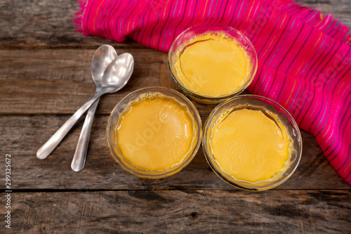 © Guajillo studio, Naklejka premium Vanilla flan dessert on wooden background