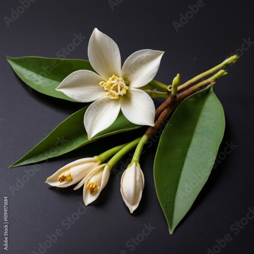 Fototapeta premium vanilla flower with pods and leaves isolated