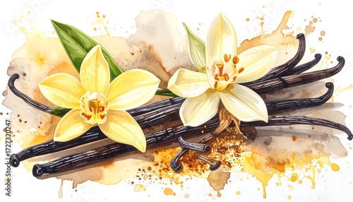 © Cindy, Fototapeta premium Vanilla flowers and pods with soft, watercolor-style splatters, artistic illustration