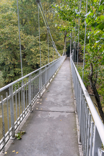 Obraz premium Vanishing suspension footbridge with rails to church of Agia Paraskevi Tempi. Pieria, Greece.