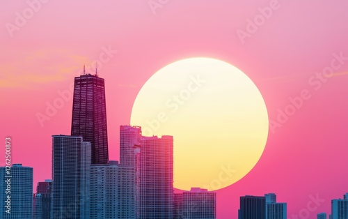© Wimon, Fototapeta premium Vaporwave-inspired tropical skyline with a massive glowing sun setting behind the skyscrapers, blending nostalgic 80s vibes with modern aesthetics