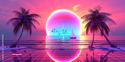 © Taras, Fototapeta premium Vaporwave neon palm with sun and tropical beach. Violet pink miami ocean, summer and 80s glow sky. Holographic retro cyberpunk paradise. Exotic poster