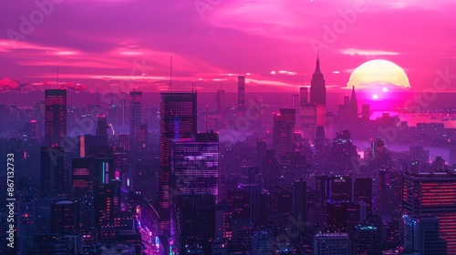 Obraz premium vaporwave style city skyline with buildings and skyscrapers, a purple sun is setting in the background, cyberpunk aesthetic, dark fantasy, neon lights