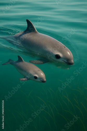 Obraz premium Vaquita Mother and Calf Swimming Near Surface in Sea of Cortez with Sunlight and Seagrass Below, Photorealistic Underwater Marine Wildlife Scene