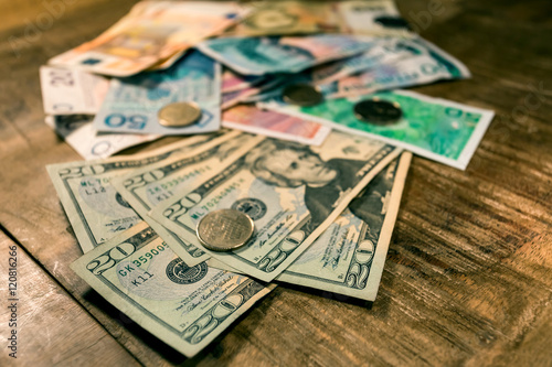 © lstudio, Naklejka premium Variable banknotes on wooden table, currency exchange