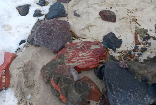 Obraz premium Varied Colored Rocks on Sandy Beach with Snow Patches in Winter