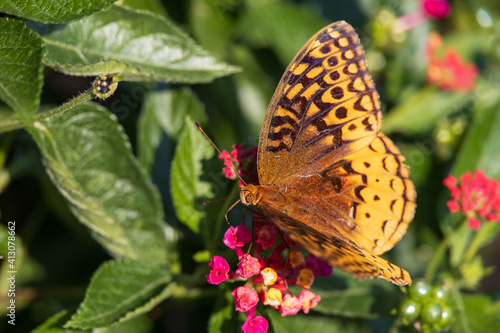 Obraz premium Variegated Fritillary butterfly on Lantana flowers