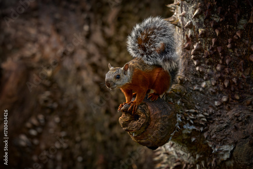 © ondrejprosicky, Obraz premium Variegated Squirrel, Sciurus variegatoides, with food, head detail portrait, Costa Rica, Wildlife scene from Central America. Prickle spine thorn big tree with squirrel. Costa Rica wildlife.