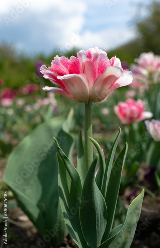 © Evgeniya Fedorova, Naklejka premium Variegated terry tulip in a flowerbed with buds