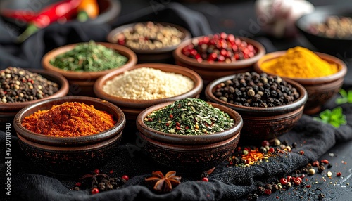 © Liopi, Fototapeta premium Variety of Colorful Spices in Small Bowls on Black Cloth