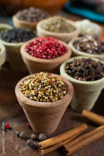 © barmalini, Fototapeta premium Variety of different asian and middle east spices, colorful assortment, on old wooden table