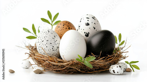 © NongKirana, Obraz premium variety of eggs in straw nest with green herbs, showcasing different patterns