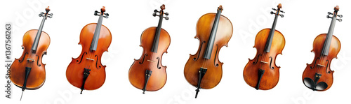 Fototapeta premium Variety of elegant cellos and violins displayed from flat lay view isolated on transparent background