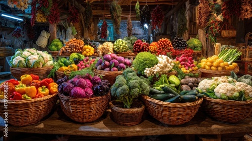 Fototapeta premium Variety of fresh vegetables beautifully displayed in wicker baskets at a...