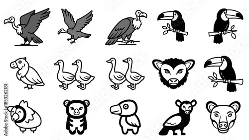 Obraz premium Variety of illustrated birds and animals in black and white outline