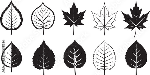 Fototapeta premium Variety of leaf shapes and patterns in black and white illustrations leaves nature