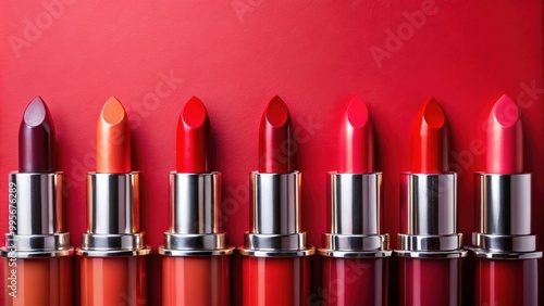 © Sujid, Obraz premium Variety of lipstick shades on red background with swatches, lipsticks, makeup, cosmetics, beauty