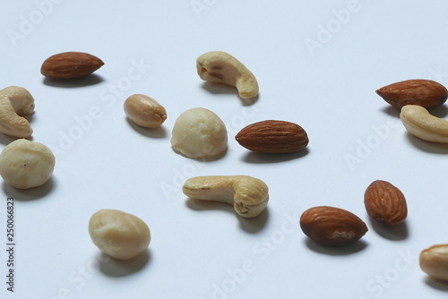 Obraz premium Variety of nuts on white background. Macadamia,cashew,peanuts and almond nuts.