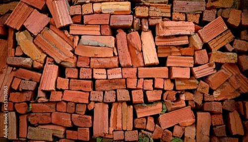 Fototapeta premium Variety of red bricks stacked haphazardly in a construction yard