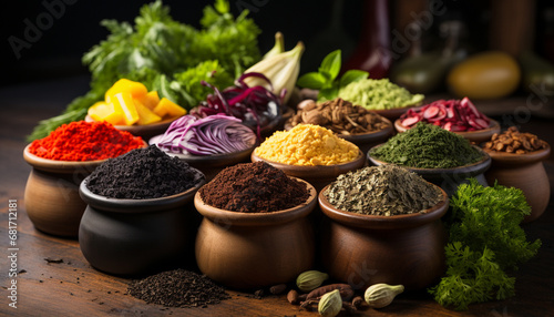 Fototapeta premium Variety of spices in wooden bowl, enhancing healthy vegetarian cooking generated by AI