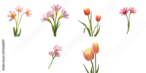 © The 2R Artificiality, Naklejka premium variety of spring flowers including pink tulips and delicate blossoms isolated on transparent background for seamless layering or use in digital design projects