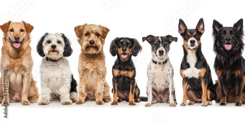 © quietmind_art, Obraz premium Variety of Ten Different Dogs Sitting Side by Side - Canine Companions for Pet Enthusiasts and Animal Lovers.